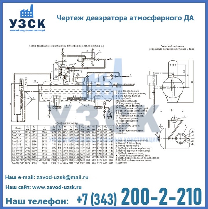 Приобрести качественное оборудование, в том числе, деаэраторы ДА, можно в компании УЗСК в Энгельсе. Мы предлагаем долговечную и надежную продукцию по приемлемой цене. Заказать и купить деаэраторы или другие изделия высокого качества можно через сайт Уральского Завода Стальных Конструкций, или позвонив по указанному в разделе «Контакты» телефону.